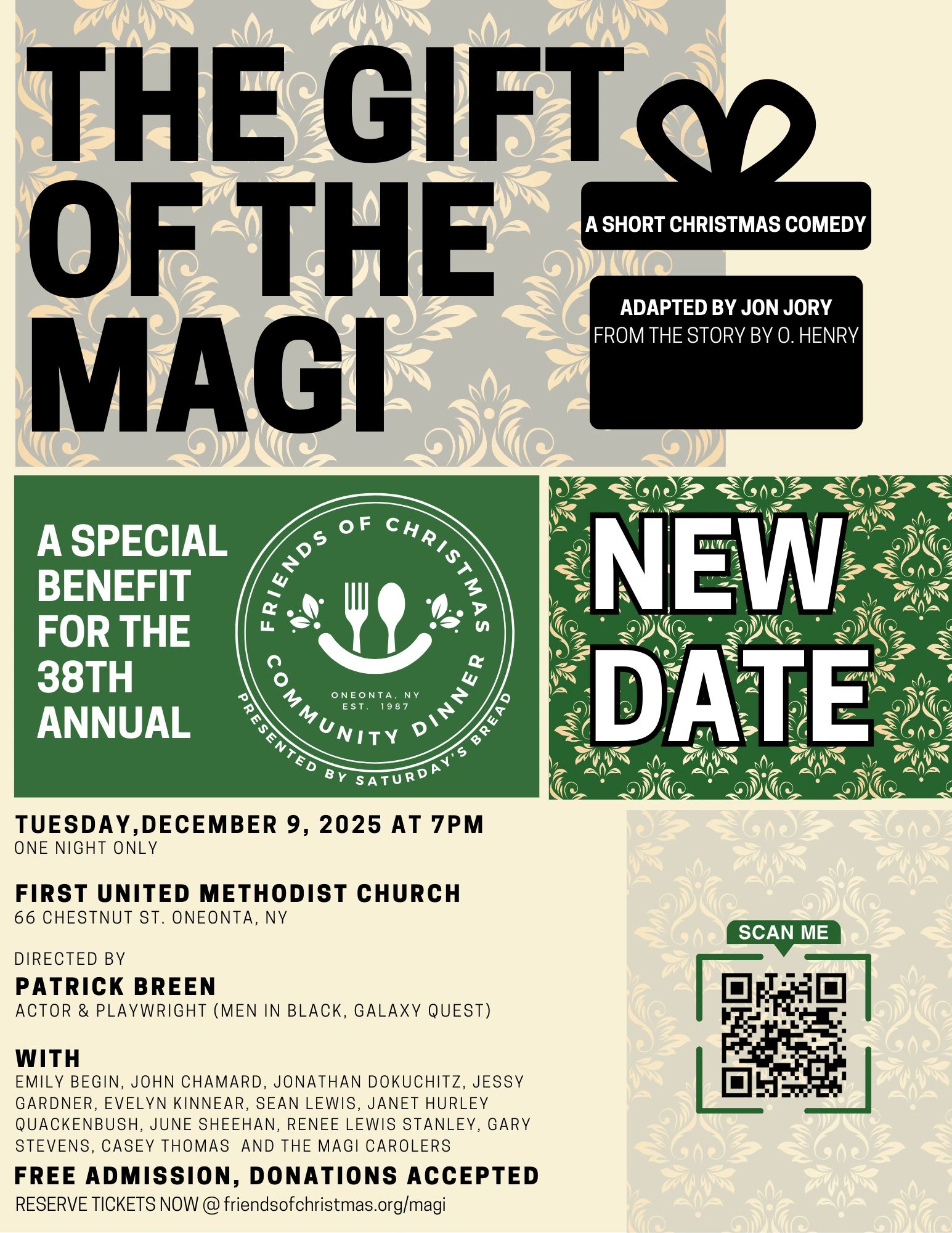 Join us for a magical evening on December 9 at 7:00 PM at the First United Methodist Church, 66 Chestnut Street, Oneonta. Celebrated actor and director Patrick Breen will once again direct a heartwarming reading of "The Gift of the Magi," adapted by Jon Jory from the story by O. Henry.